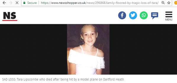 Tara Lipscombe: 13 years old, Dartford, England. She died after being struck in the head by a model plane while walking in the park with her family near a designated RC flying area.