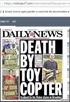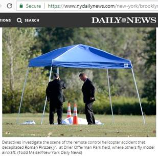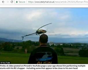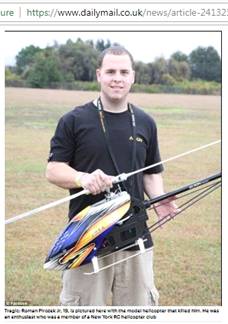 Roman Pirozek Jr: 19 years old, New York, USA. He died after partially decapitated himself while performing maneuvers as the blades of the RC helicopter he was operating sliced off a piece of his skull and slashed his throat.
