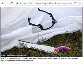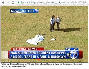People are dying so that someone can play with an RC aircraft (aka Drone). This is about the recreational use of drones, not about the use of this technology in a warzone. Many of the following deaths are not just the operators themselves but innocent people who had nothing to do with the activity. It often seems to be a matter of being in the wrong place at the wrong time; being within range of a drone when an operator is using it. Remember these are remotely piloted vehicles. This is a serious issue that has not been properly addressed and one has to wonder why this inherently dangerous recreational activity has been allowed to continue to operate close to people. This recreation has destroyed families. The following list shows that this is not simply an isolated incident, but a growing risk as the technologies become more powerful, faster, cheaper and more accessible. For neighbors who are exposed to the risks from an RC flying club, it is easy to recognize the dangers. This subject deserves respect not excuses. There are many more deaths than what are listed below as the intention is not to be a complete list but to show that the risk of death is real. Note that details of events are not always easy to find. The following provides information sourced from multiple news sites for the purpose of showing the real dangers involved with the recreation. Our hearts are with the families who are victims of this recreation. These people died and change is needed to ensure that this does not continue to happen in the future.