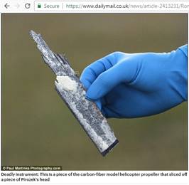 The high-end RC helicopter has a blade span of 62 inches, with a rotor that spins at more than 2,000rpm. It weighs a little over six pounds.Pirozek's own father watched in horror as his son's helicopter slashed off a chunk of his head, the Wall Street Journal reports.