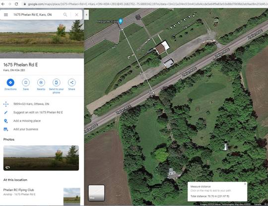 Using the 55 dBA noise limit specified in the City of Ottawa By-Law and the model jet producing 77 dBA at the neighbours’ property line the distance required to operate within the by-law can be calculated. According to the noise-distance calculator, in order to fly this model jet, the Phelan RC Flying Club’s runway should be at least 845 meters away from the neighbouring property line. This 845 meter value is not buffered so there should be even more distance to ensure that noise is contained within the club site. If aircraft with a higher dBA are operated, then the distance needs to be increased.