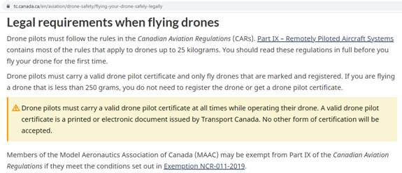 In Canada, Transport Canada sets the regulations and refers to the use of drones or RPAS. The legal requirements refer to drones so that is the principle name used to refer to the use of UAVs in the recreation.